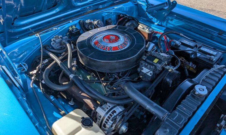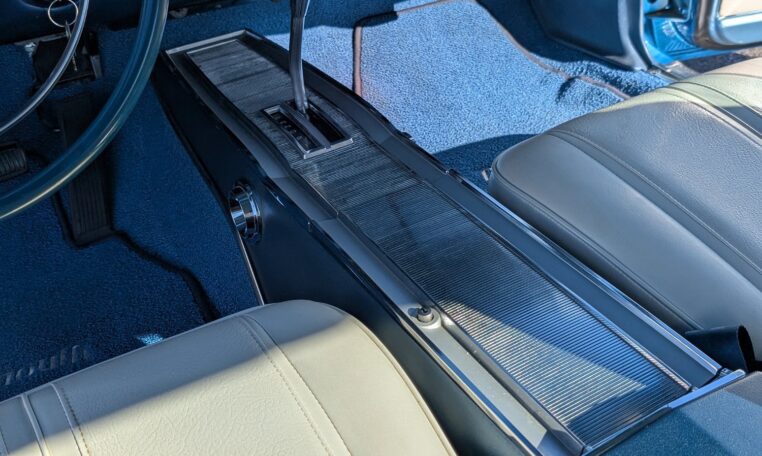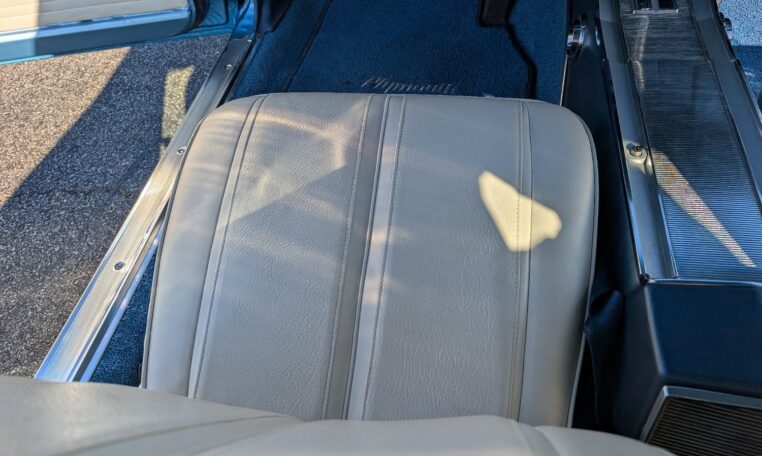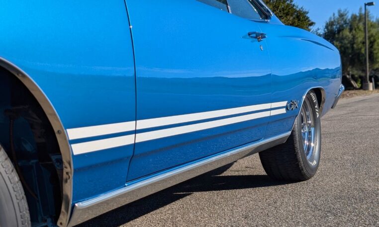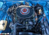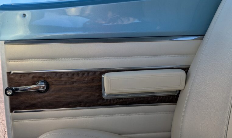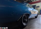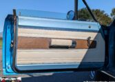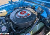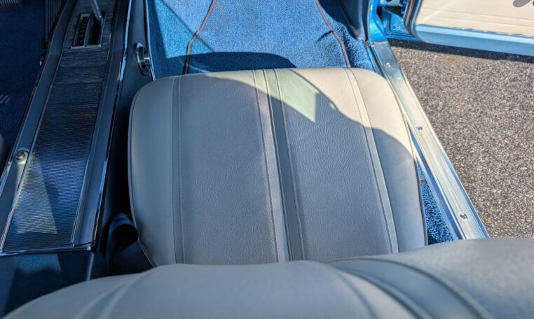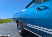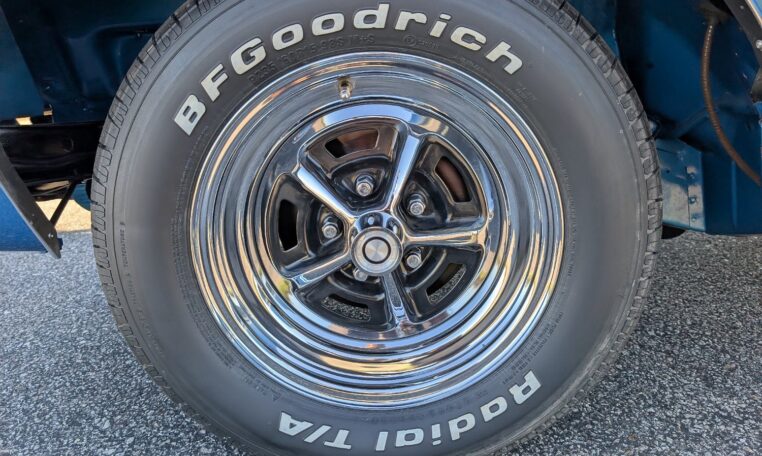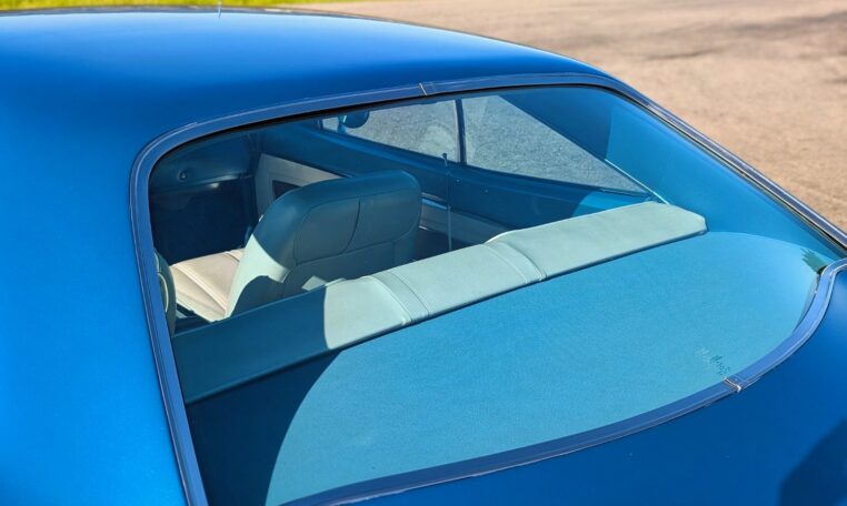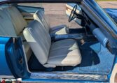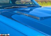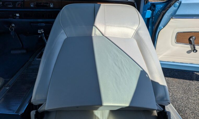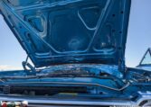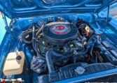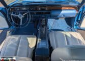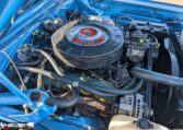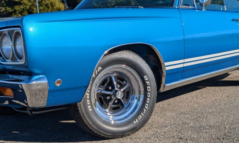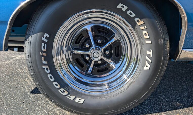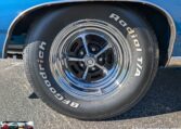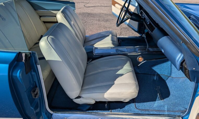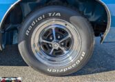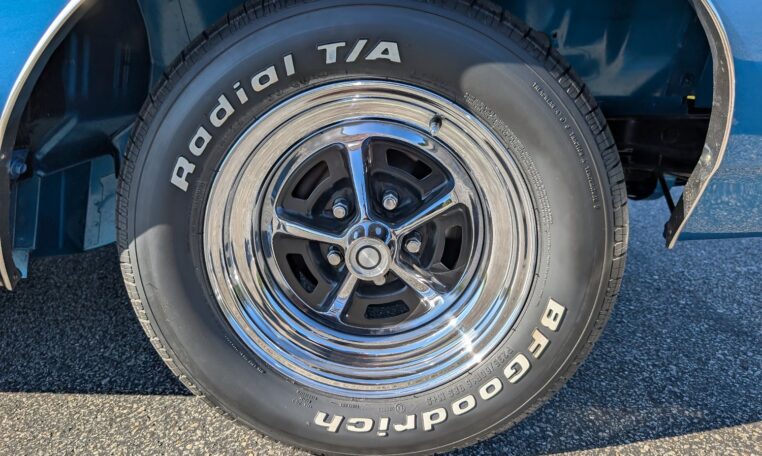 Exterior and Interior Details: Stunning Frost Blue Metallic paint with white interior, Magnum 500 wheels on BFG T/A radials and upscale features like faux hood vents and dual stripes for a gentleman’s muscle car aesthetic.