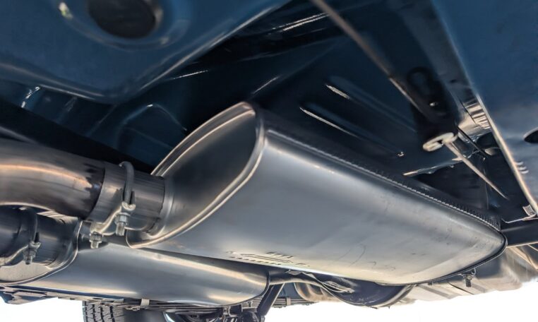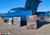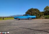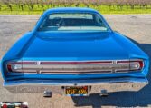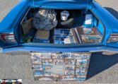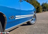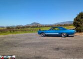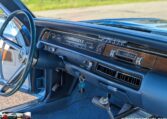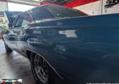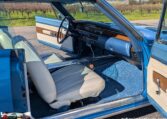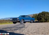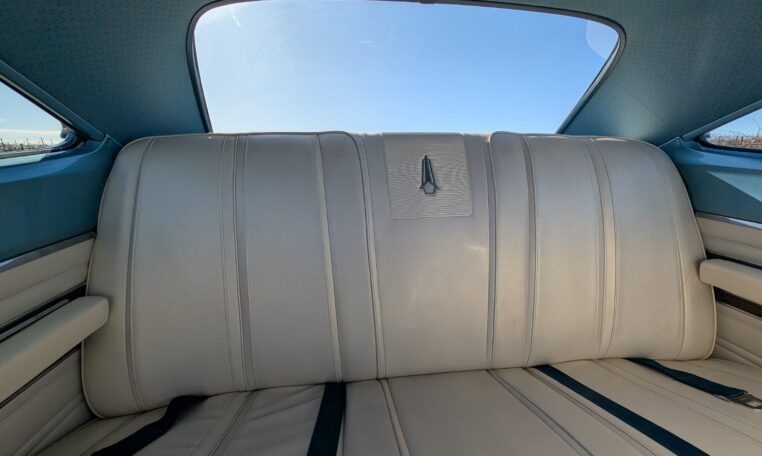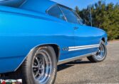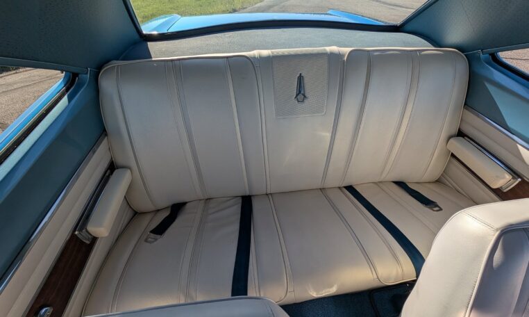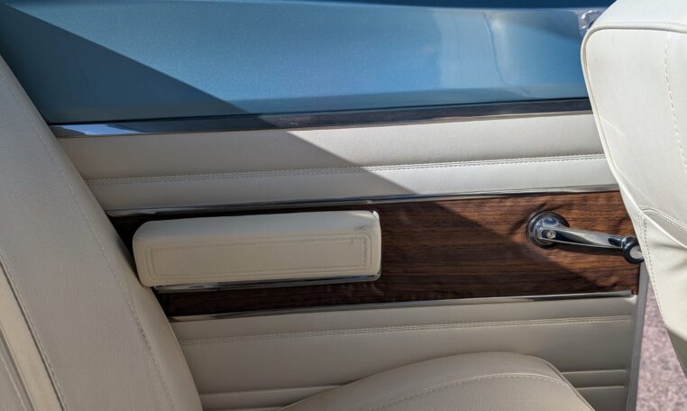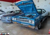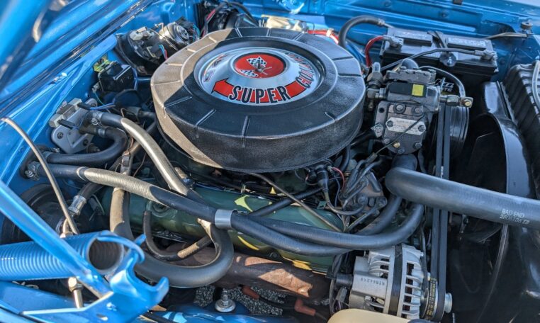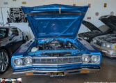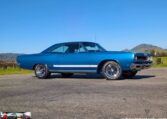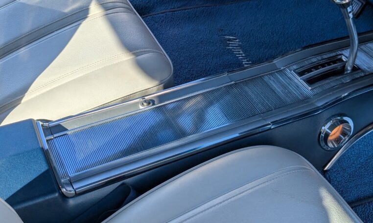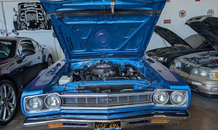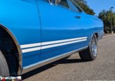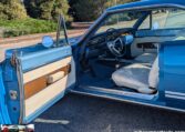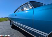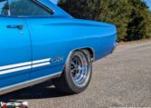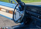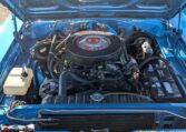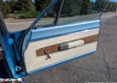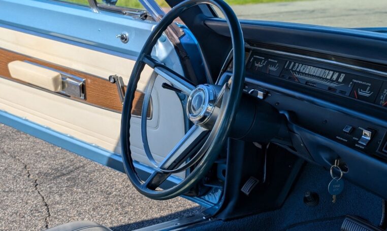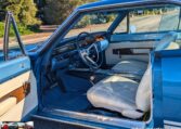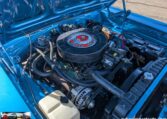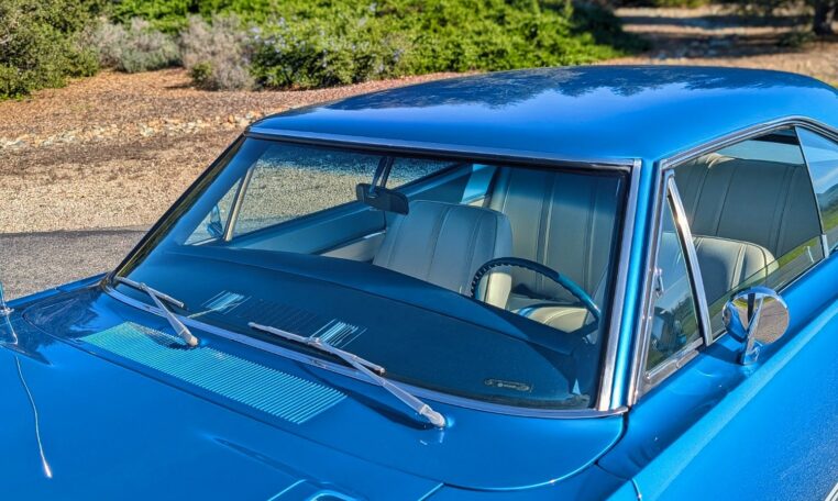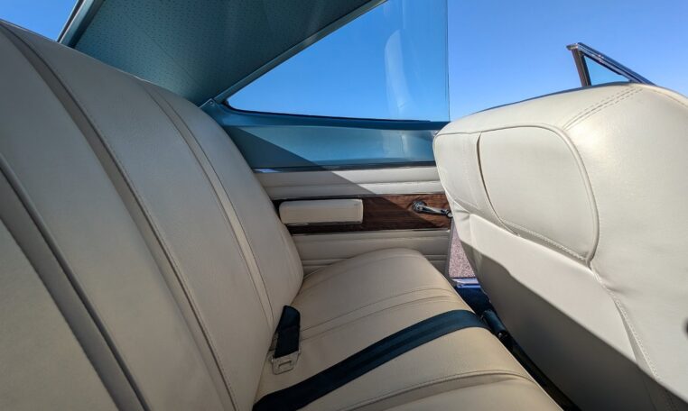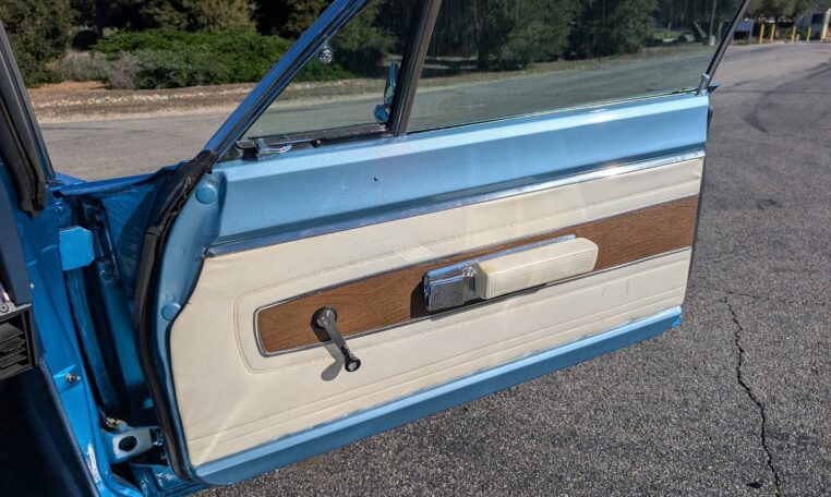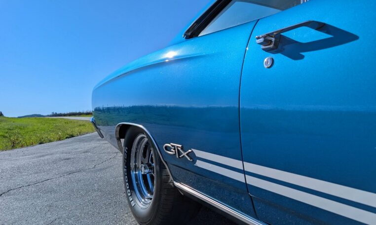 Exterior and Interior Details: Stunning Frost Blue Metallic paint with white interior, Magnum 500 wheels on BFG T/A radials and upscale features like faux hood vents and dual stripes for a gentleman’s muscle car aesthetic.