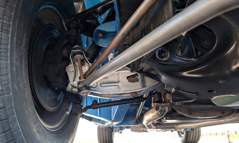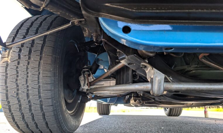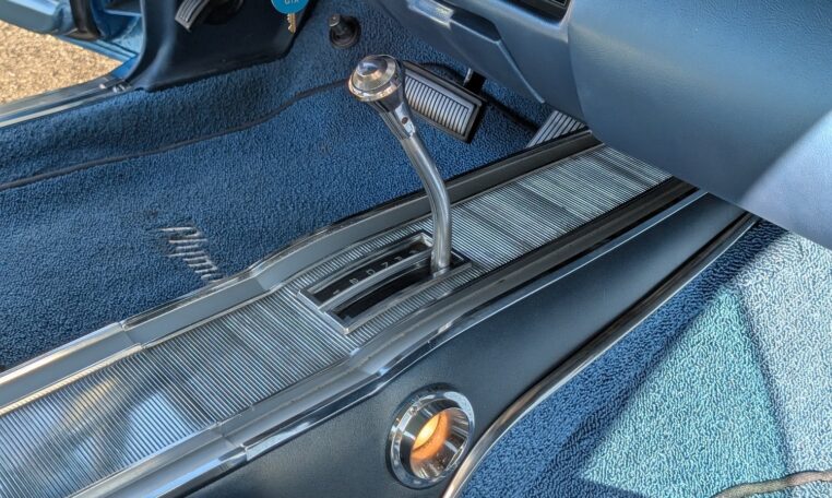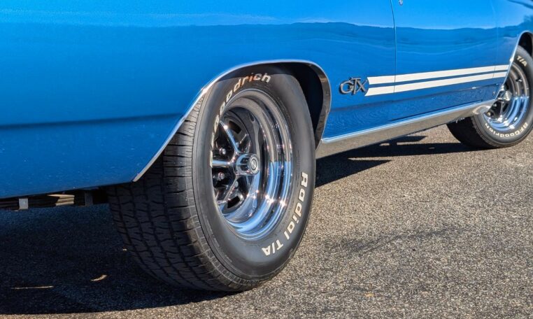 This GTX boasts a comprehensive array of stock features as per its original specifications, including a welded steel unit-body construction, independent front suspension with torsion bars and hydraulic tube shock absorbers, and rear suspension with Hotchkis-type asymmetrical leaf springs and hydraulic tube shocks. The drivetrain includes the TorqueFlite 727 three-speed automatic transmission with gear ratios of 2.45:1 (first), 1.45:1 (second), and 1.00:1 (third), paired with a stock converter and shifter. Braking is handled by 11.04-inch front discs with single-piston calipers and 11.0 x 2.5-inch rear drums. Wheels are 15×7 (front) and 15×8 (rear) Magnum 500 chrome-plated steel rims in G60-15 Goodyear Redline GT tires that are currently wrapped in BFG Radial T/A tires.