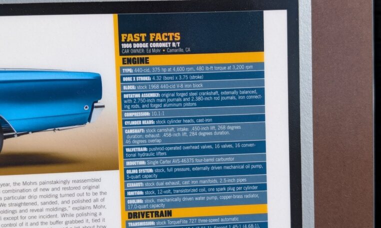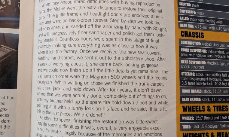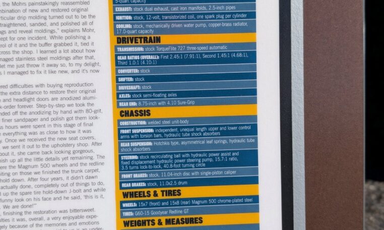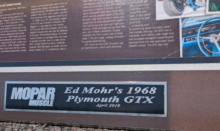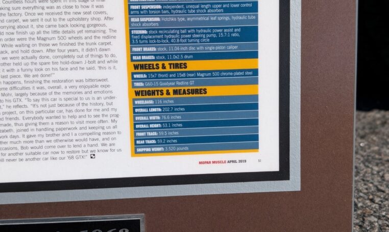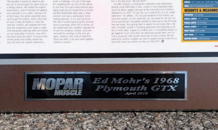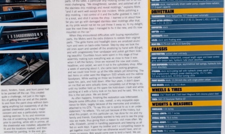 After four years, it didn’t dawn on me that we were actually done, completely out of things to do, until my brother held up the spare tire hold-down J-bolt and with a funny look on his face and he said, ‘this is it, We are done!'” The restoration was bittersweet. Despite some difficulties it was, overall, a very enjoyable experience for Mohr, largely because of the memories and emotions attached to his GTX. “To say this car is special to us is an understatement,” he reflects. “It’s not just because of the history, but what this project, on this particular car, has done for me and my family and friends. Everybody wanted to help and to see the progress we made, thus giving them a reason to visit more often. My wife, Elizabeth, joined in handling paperwork and keeping us all fed on work days.