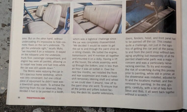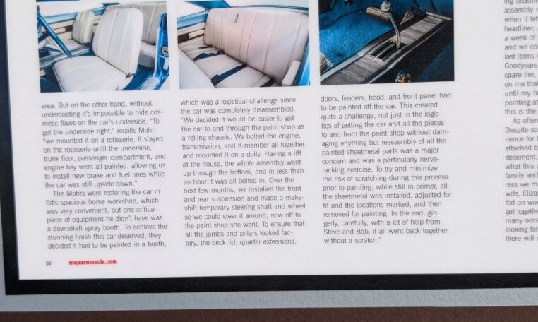 Featured in Mopar Muscle Magazine: Spotlighted in the April 2019 issue (Volume 32, Number 4) with a detailed feature story on its history, restoration, and emotional significance to the owners.