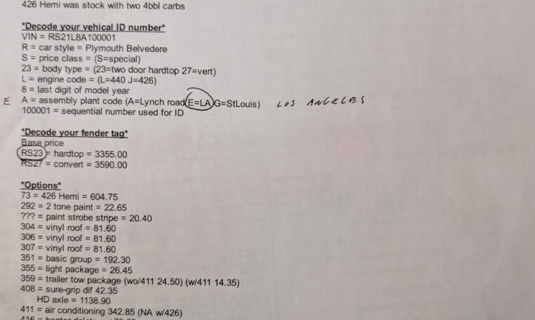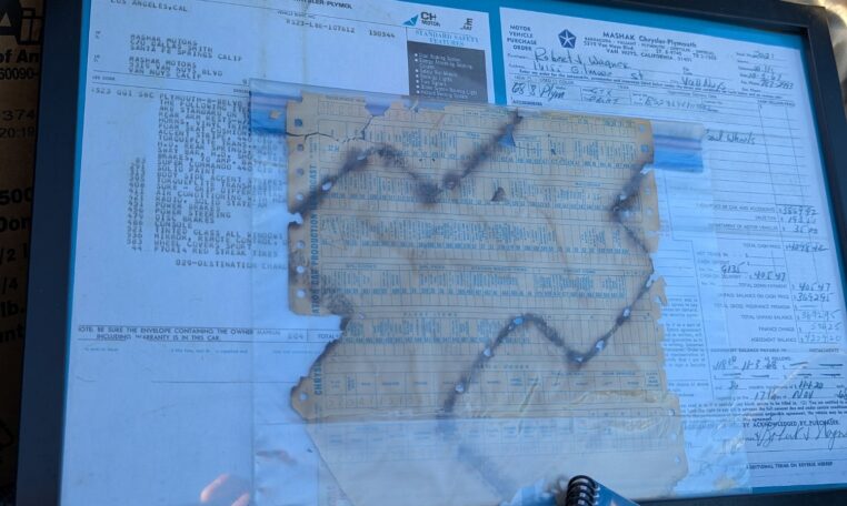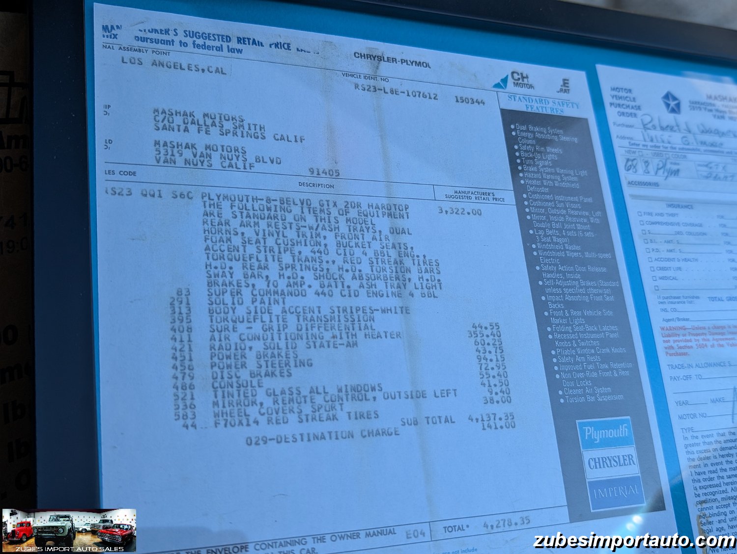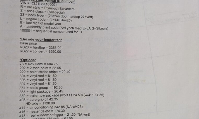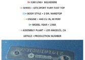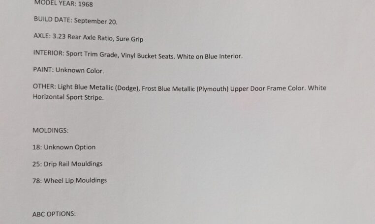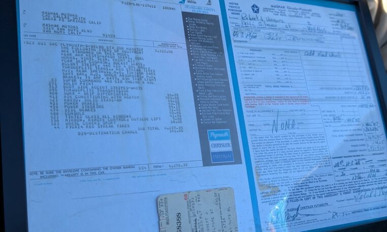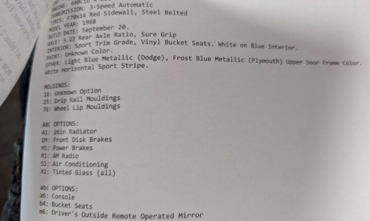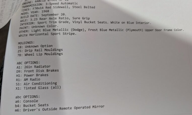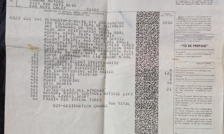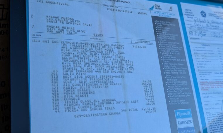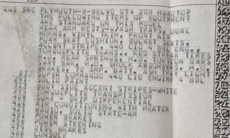Original Window Sticker and Build Sheet: Comes with the original window sticker outlining factory options and the build sheet confirming specifications like the 440 V8, automatic transmission, and color combo.