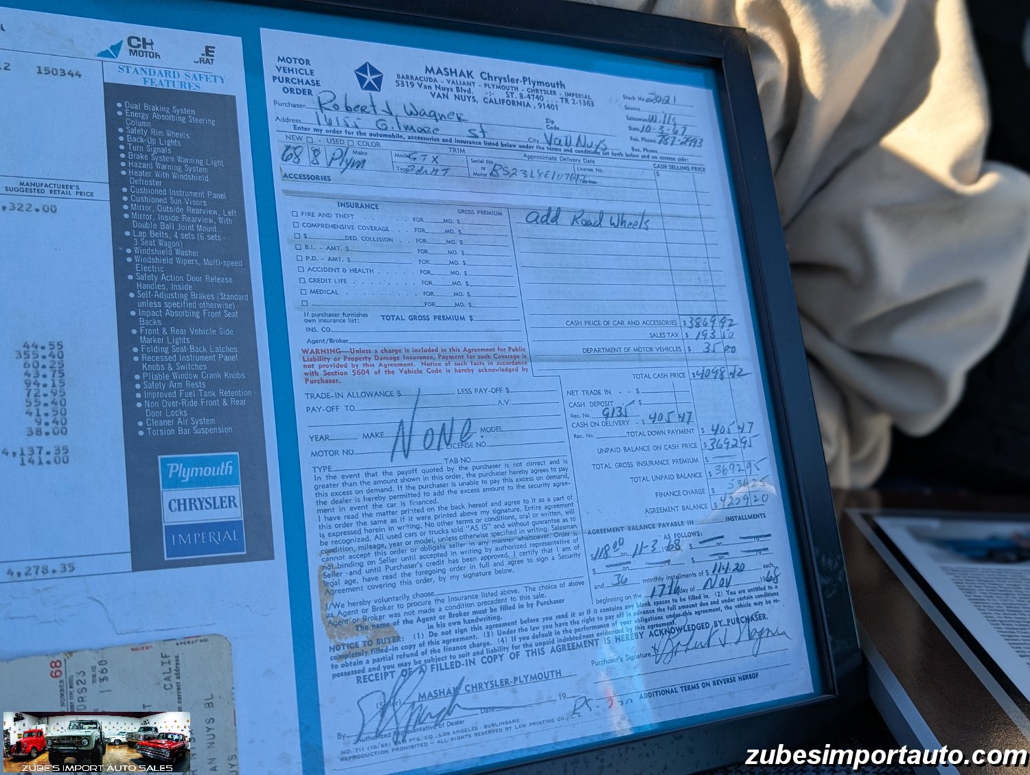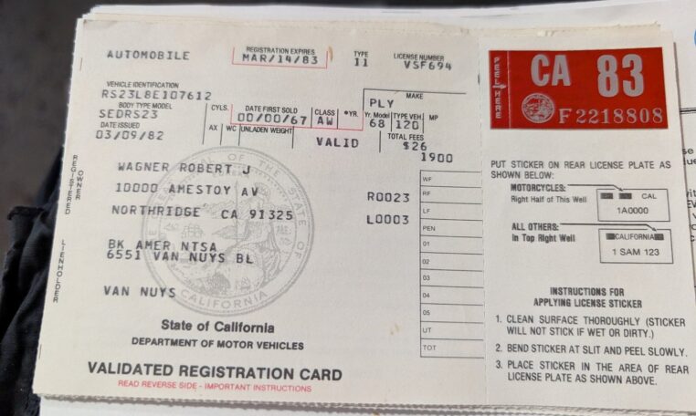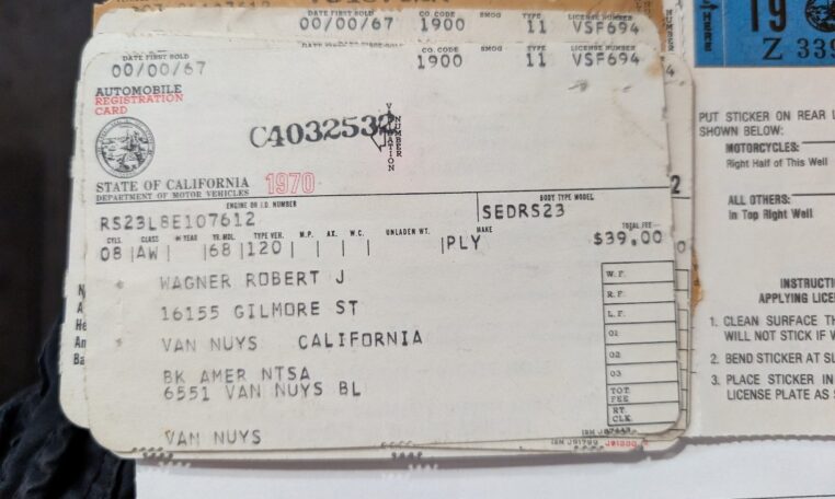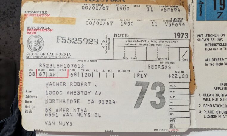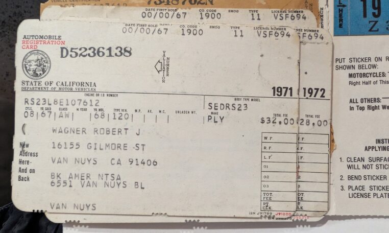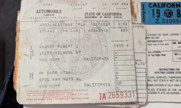 Two-Owner History: Purchased new by Bob Wagner in 1967 from Van Nuys Plymouth dealer Mashak Motors, then sold in 2014 to his childhood friend Steve Mohr, maintaining a tight chain of custody.