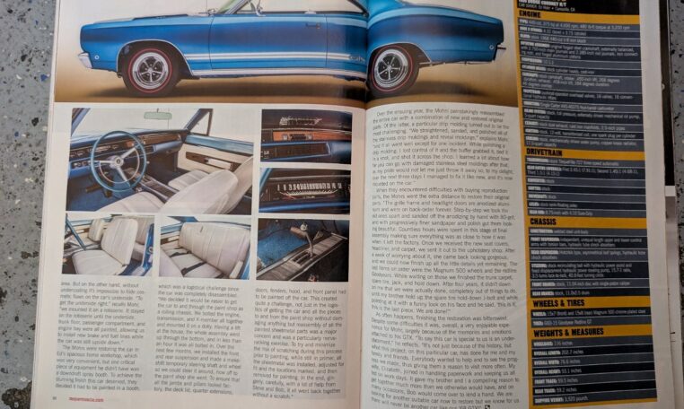 Ultimately, every panel was worked over to remove dings and dents, and each skim coated and primed and blocked several times.” Since this GTX was delivered new in California, it never had undercoating, which is generally a blessing for a car that’s lived its whole life in a dry, salt-free environment.Over the ensuing year, the Mohrs painstakingly reassembled the entire car with a combination of new and restored original parts. Of the latter, a particular drip molding turned out to be the most challenging. “We straightened, sanded, and polished all of the stainless drip moldings,” explains Mohr, “and it all went well except for one incident.