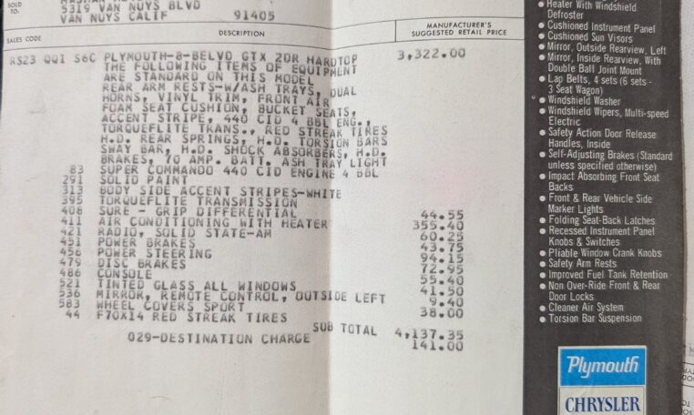 For all you Mopar fans, this is the ’68 Plymouth GTX you need in your collection! What sets this ’68 GTX apart from the others is its provenance and the story behind it. A fully documented California GTX assembled out of the Los Angeles, CA, plant. Purchased by its original owner, who lived in California, and later sold to his childhood friend Ed Mohr, who spent 4-years doing a full rotisserie restoration with his brother. Every single document is included with this car, including its original window sticker and sales invoice sold by MASHAK Chrysler-Plymouth in Van Nuys, CA, in October of 1967! Featured in Mopar Muscle magazine in 2019.