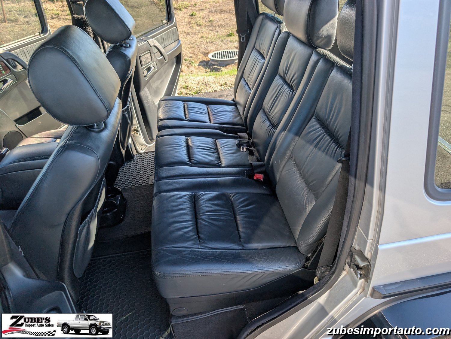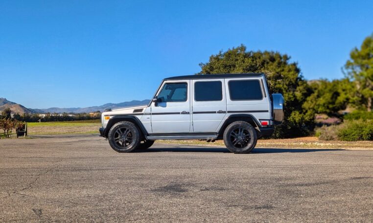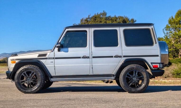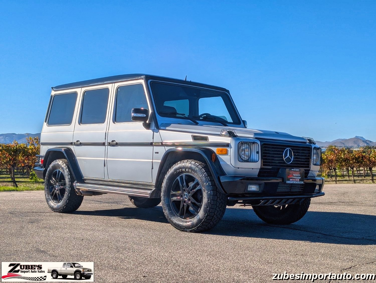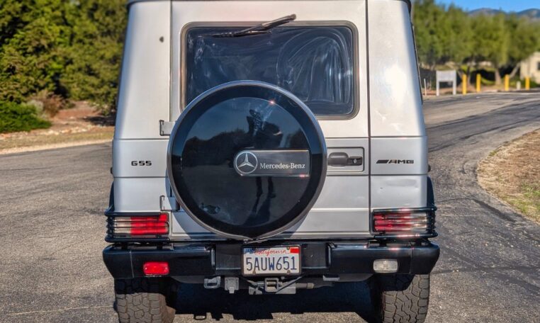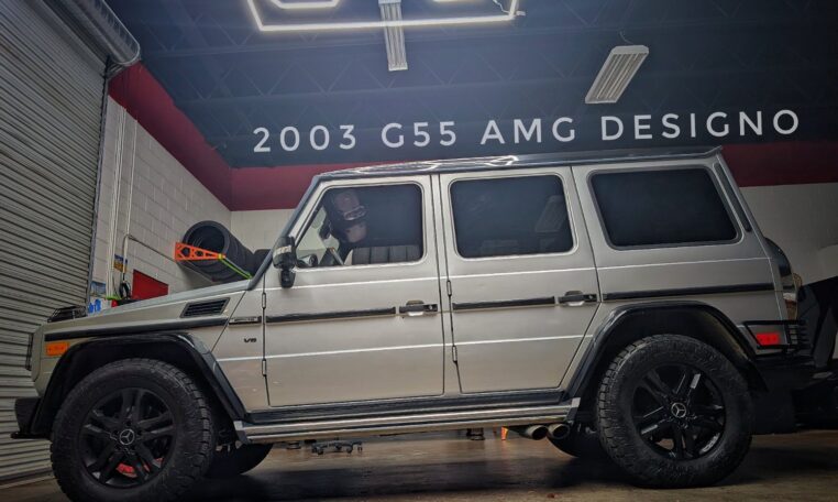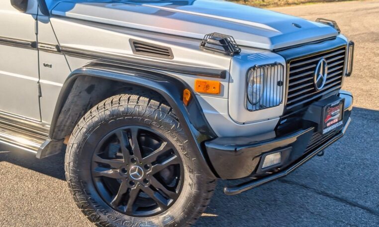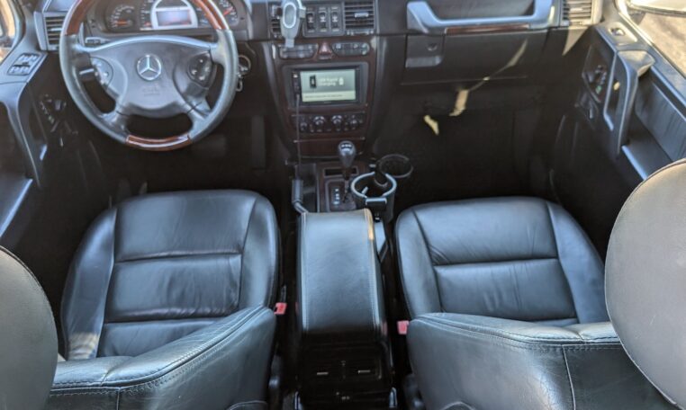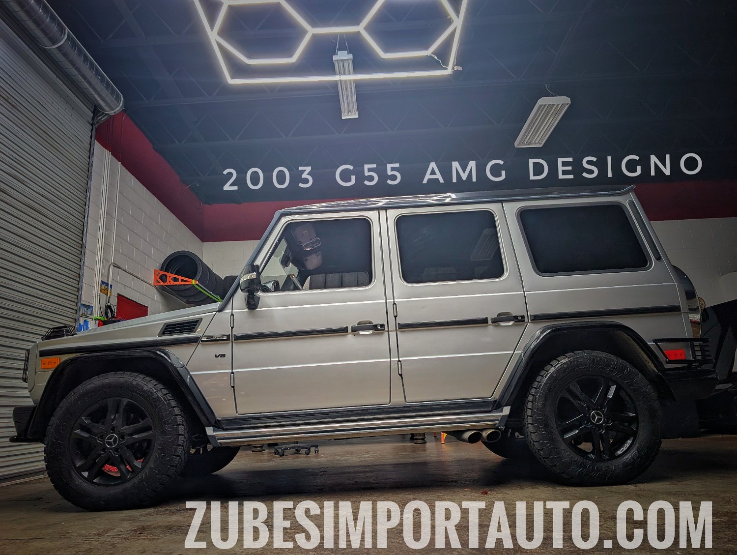 Here’s the G-Wagon you’ve been looking for! Locally owned 2003 Mercedes G55 AMG Designo with only 136k original miles! Finished in Silver Metallic with black leather interior. The DESIGNO custom package includes black OEM 18″ Mercedes wheels wrapped in new TOYO Open Country A/T tires, gloss black fender flares, tinted windows, black roof, front and rear gloss black bumpers with front lower bumper guard bar, taillight guards, and front headlight protection guard grills that set this G55 off. Most of the Silver G Wagon’s on the market have color-matched front and rear bumpers with zero contrast so this one stands out from the rest. The engine was hand-assembled in a dedicated AMG facility in Affalterbach, Germany- the 5.4 Liter V8 paired with a 5-speed automatic transmission and triple-lock differential! Well maintained with a majority of its services coming from Fletcher Jones Motorcars of Newport Beach, CA.