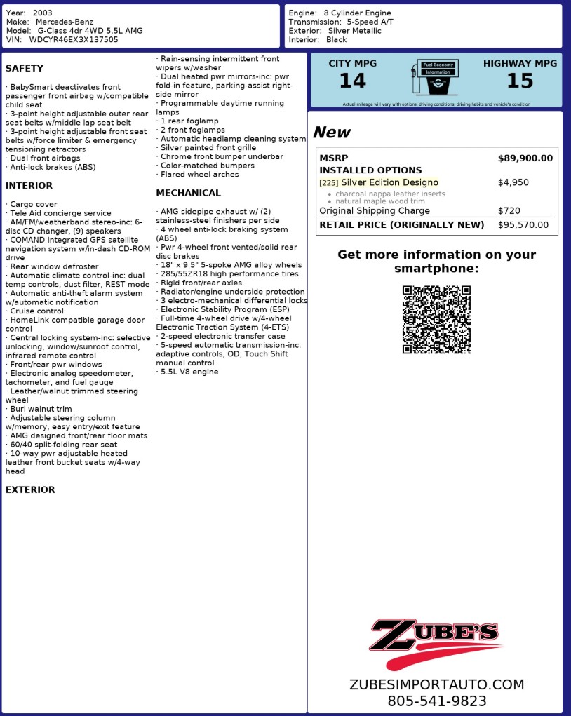 VINWDCYR46EX3X137505 MakeMercedes-Benz ModelG-Class Year2003 TrimG55 AMG