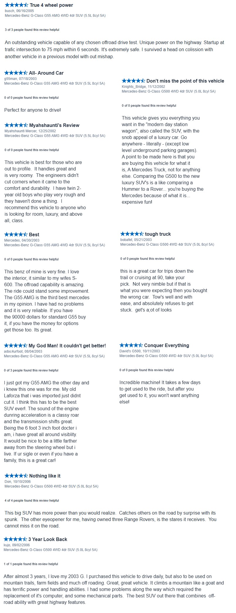 In performance, the G55 AMG outperforms competitors in the luxury midsize SUV category with its naturally aspirated V8, delivering more raw power than the 2003 BMW X5 4.6is (340 hp, similar torque but less off-road capable) or Porsche Cayenne Turbo (450 hp, faster but higher maintenance). It’s more rugged than the Lexus GX 470 (less power at 235 hp but similar luxury), prioritizing off-road dominance over on-road agility, as seen with its triple-lockers for superior capability in extreme terrain. Compared to the Land Rover Range Rover (282 hp, luxurious but less reliable), the G-Wagon offers superior build quality and longevity, with owners reporting 300,000+ miles. The G55’s acceleration and torque make it fun for highway blasts, though its 5,500-lb weight and truck-like handling mean it’s not as nimble as modern crossovers.