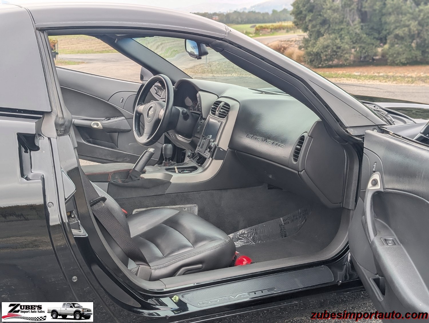 The 2007 Chevrolet Corvette 1LT Z51 offers a driver-focused suite of features, enhanced by the Z51 performance package, making it a track-ready sports car with street usability. The black leather interior is supportive and premium, paired with the black exterior for a menacing look. Key features include a 6-speaker Boston Acoustics audio system with CD player, 6-way power driver’s seat, power windows/locks, cruise control, a leather-wrapped steering wheel with audio controls, and the Heads-Up Display (HUD). The Z51 pack adds performance-tuned suspension with stiffer springs and shocks, larger sway bars for reduced body roll, heavy-duty brakes with drilled performance rotors (13.4-inch front rotors), and a 3.42 rear gear ratio for quicker acceleration and better track performance, dropping curb weight to 3,239 lbs for superior handling.