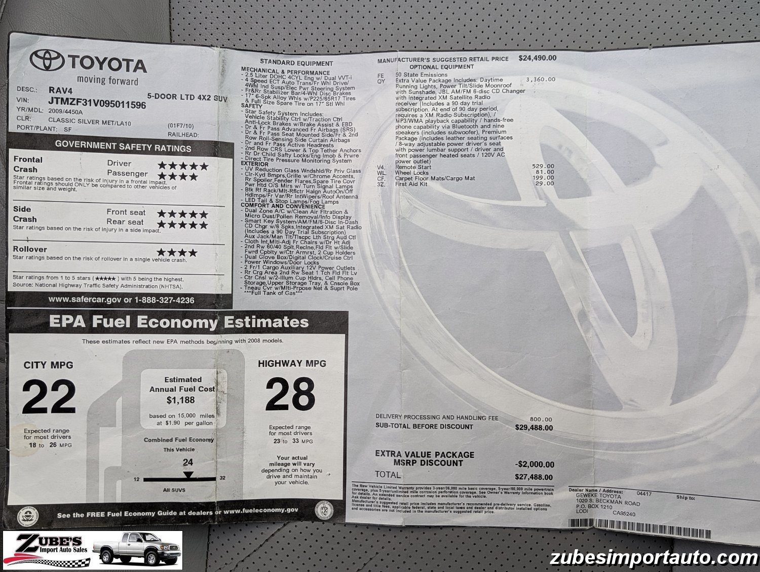 Rare and hard to find 2009 Toyota Rav4 Limited 2WD with only 162k original miles. Powered by the always reliable 2.5 Liter 4-Cylinder paired with a 4-speed automatic transmission. Finished in Classic Silver with Ash leather interior. Options include the Extra Value Package that gives you daytime running lights, JBL Premium audio with subwoofer, moonroof, XM satellite radio, MP3/WMA playback capability, bluetooth handsfree calling, heated front seats, 120V AC power outlet, remote start, and much more. The perfect compact SUV that gets solid fuel economy rated at 22 City/ 28 Highway MPG. Fully serviced and ready to go for its new owner. This ’09 Rav4 Limited is offered with a three-owner clean carfax, 26 service records, and a Clean California title.