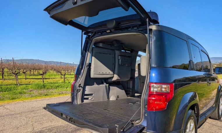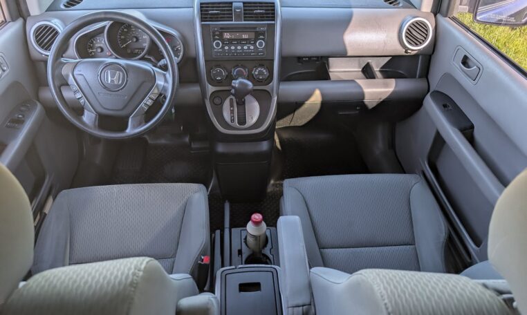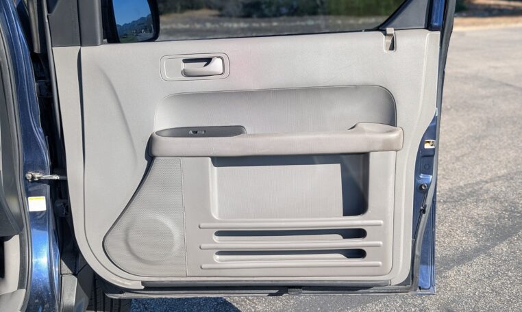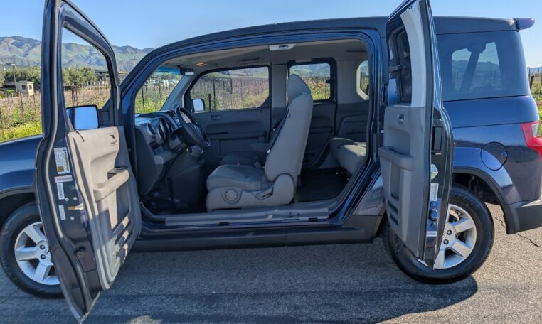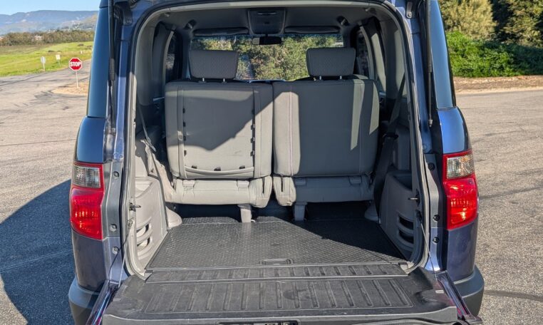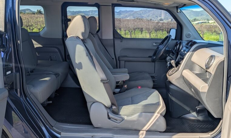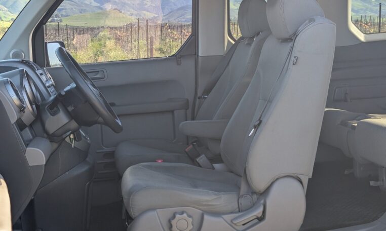 This configuration is perfect for adventurers or urban dwellers needing to transport large gear without hassle, as the wide side doors and low load height make loading easy. The rubberized floors and wipe-down surfaces are waterproof, ideal for messy loads like wet gear or pets, and the front seats can recline flat to form a bed for camping. Storage options include numerous compartments, cup holders, and a removable cooler/storage bin between the front seats. This level of versatility, combined with the Element’s boxy shape that maximizes interior volume (75.0 cubic feet passenger space), makes it a favorite for outdoor enthusiasts, small business owners, or anyone needing a flexible vehicle.