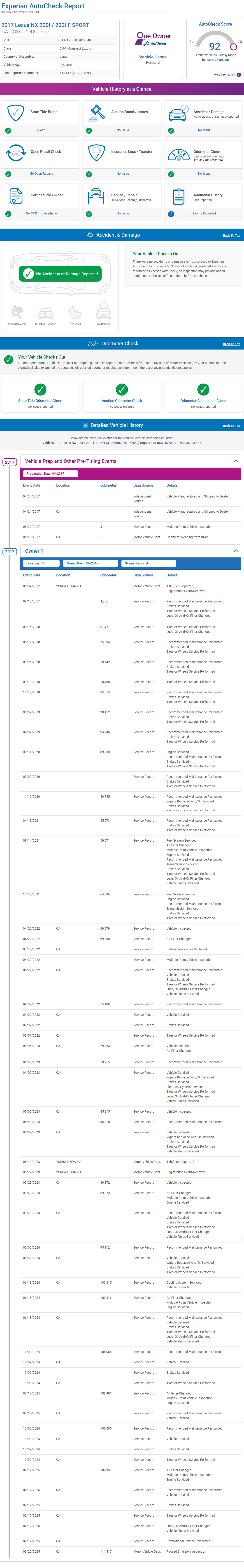 - Ownership: One owner with clean Carfax/AutoCheck (92 score) and no accidents.