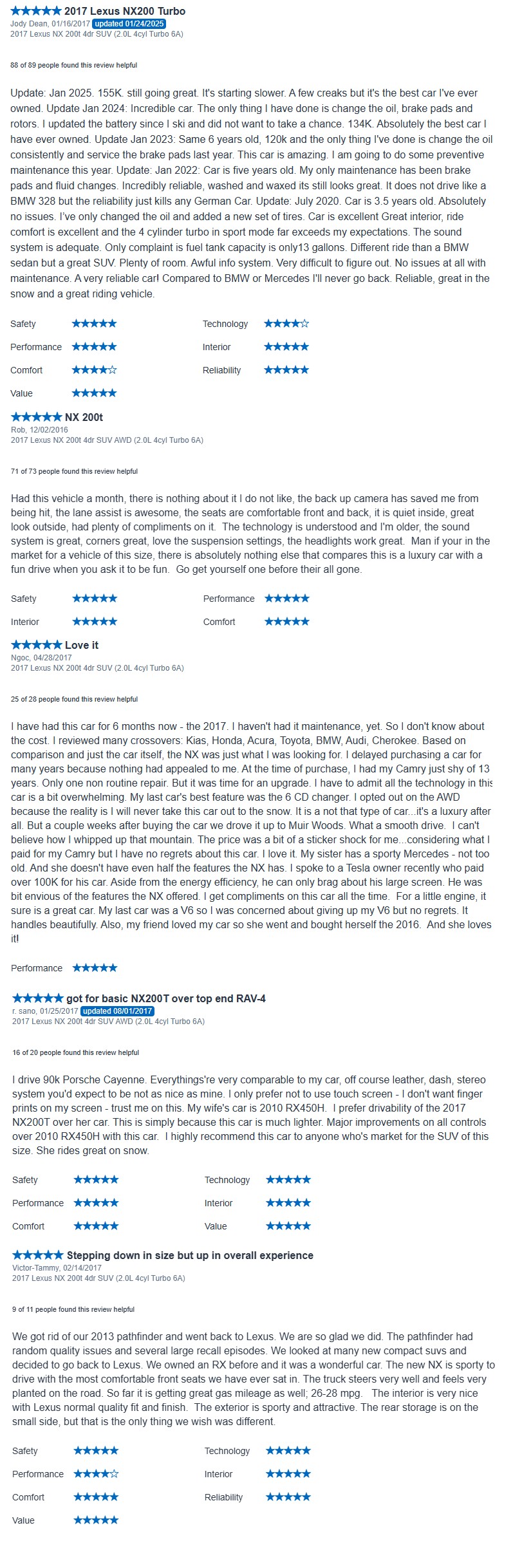 Equipped with Lexus Safety System+ (including pre-collision braking, lane departure alert, and adaptive cruise control on equipped models), eight airbags (front, side, knee, and side curtain), anti-lock brakes (ABS) with Electronic Brake Distribution (EBD), Brake Assist, Vehicle Stability Control (VSC), traction control, hill-start assist, and a tire pressure monitoring system, the NX 200t earns a perfect 5-star rating in side crash tests and overall. The 4-star rollover rating is solid for a compact SUV, reflecting its higher center of gravity, but its advanced chassis and electronic aids provide confidence for daily driving. The Insurance Institute for Highway Safety (IIHS) rated the 2017 NX a Top Safety Pick, earning “Good” scores in all crash tests and “Superior” for front crash prevention, further affirming its safety credentials for family use.