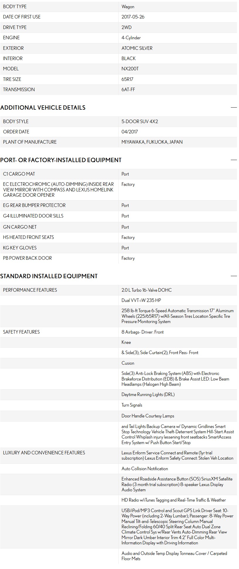 | VINJTJYARBZ9H2072649 | MakeLexus | ModelNX 200t | Year2017 | TrimFWD |