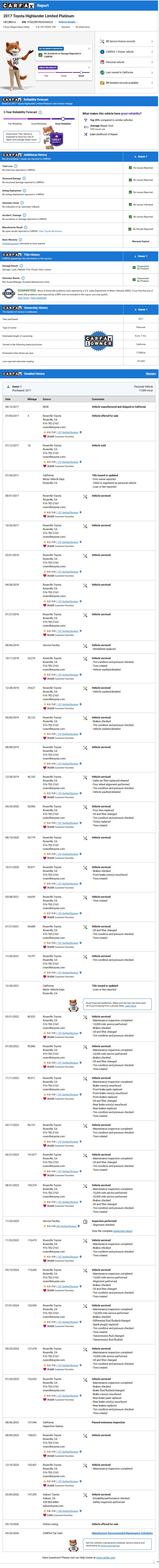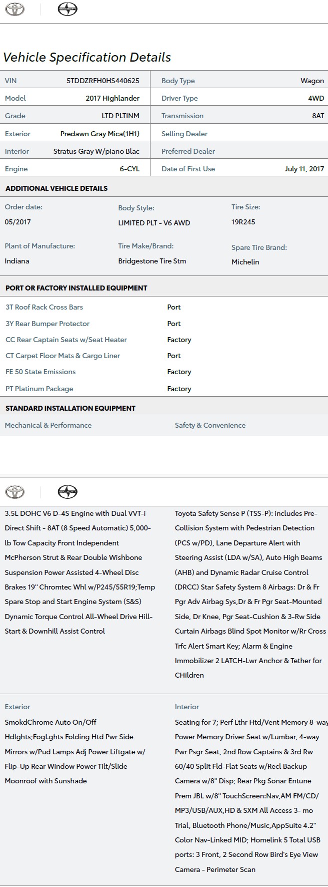 VIN5TDDZRFH0HS440625 MakeToyota ModelHighlander Year2017 TrimLimited Platinum AWD V6