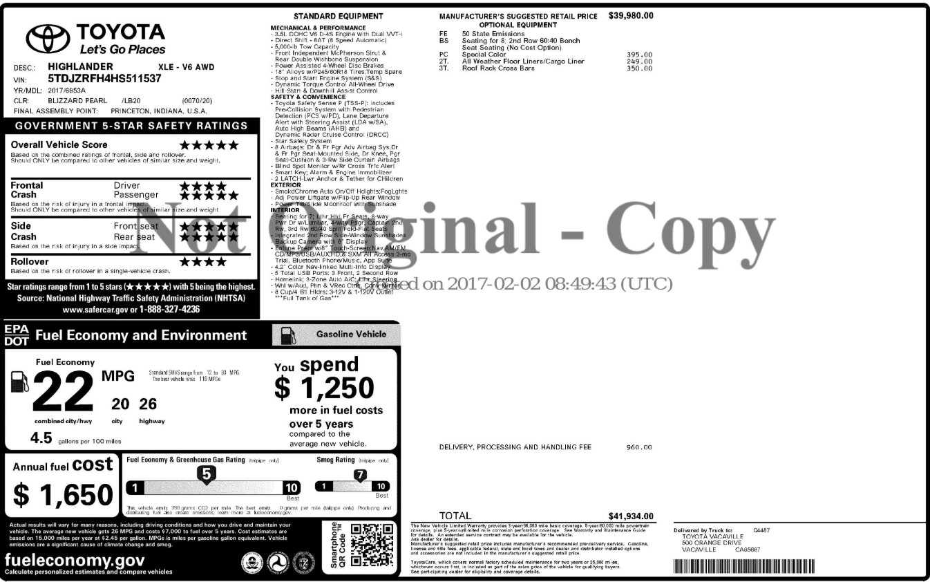 The 2017 Toyota Highlander received excellent safety ratings from the National Highway Traffic Safety Administration (NHTSA), earning an overall 5-star rating that underscores its robust construction and advanced protective technologies. These scores were based on crash tests evaluating occupant safety in frontal, side, and rollover scenarios. The Highlander’s performance is supported by features like Vehicle Stability Control, traction control, and a full suite of airbags, making it a secure choice for families.