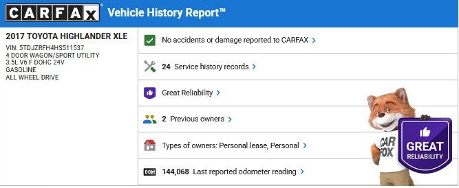 Fully loaded 2017 Toyota Highlander XLE All-Wheel-Drive with 144k original miles, two-owner clean carfax with a Great Reliability rating from its 24 service records, and a Clean California title. Finished in Blizzard Pearl with black leather interior. Powered by the super reliable 3.5L V6 (with a metal timing chain you never have to replace) paired to an 8-speed automatic transmission. Seating for seven passengers with third-row seating that folds flat for extra cargo space. Options include dual powered heated leather front seats, moonroof, navigation, Bluetooth hands-free calling, USB/AUX input, USB charge ports, back-up camera, steering wheel audio controls, push-button start, one-touch auto open/close rear liftgate, downhill assist control, SNOW drive mode, downhill assist control, and center differential lock. MSRP with options was $41,934, giving this pre-owned 2017 Highlander XLE AWD great value!